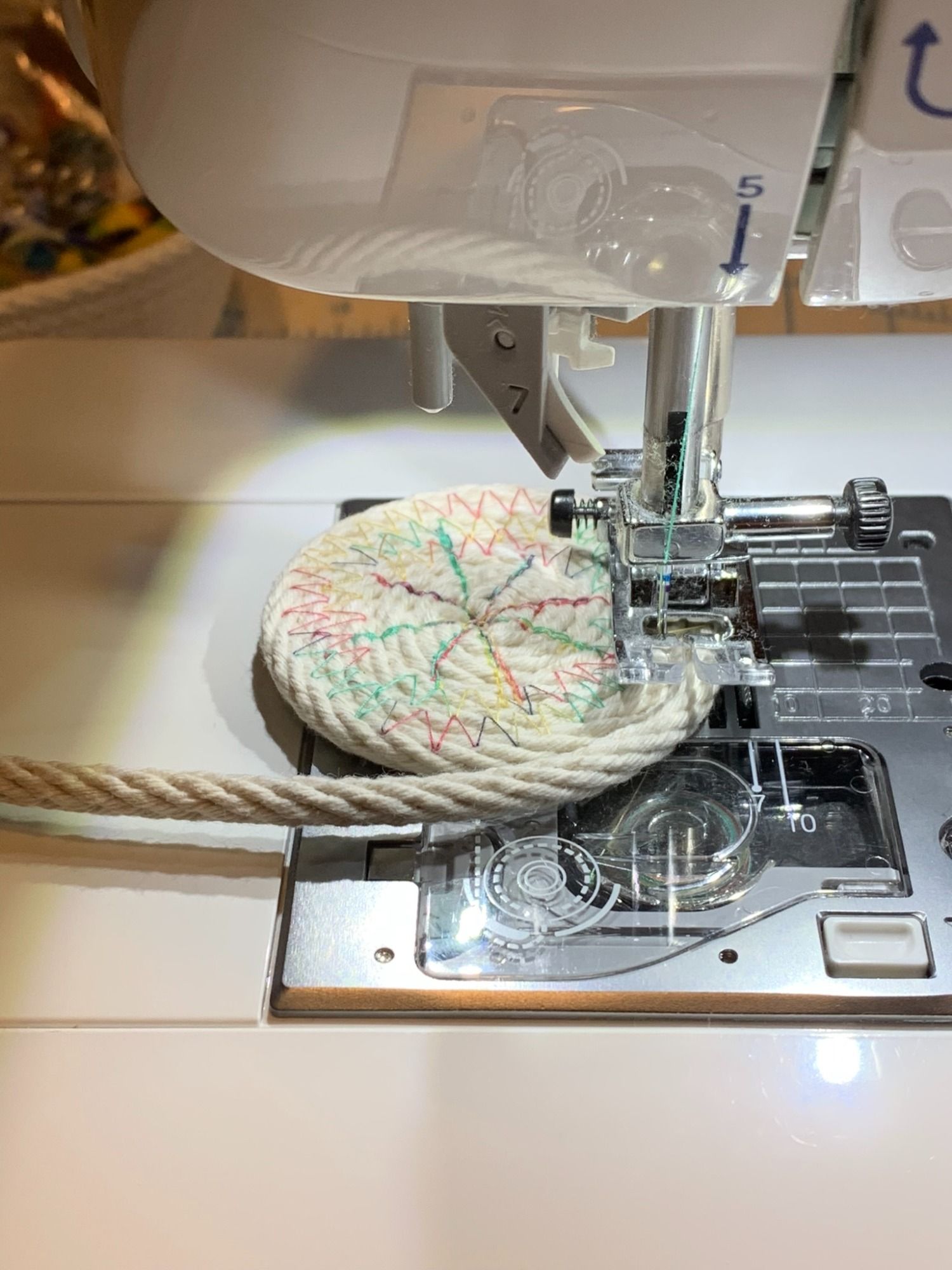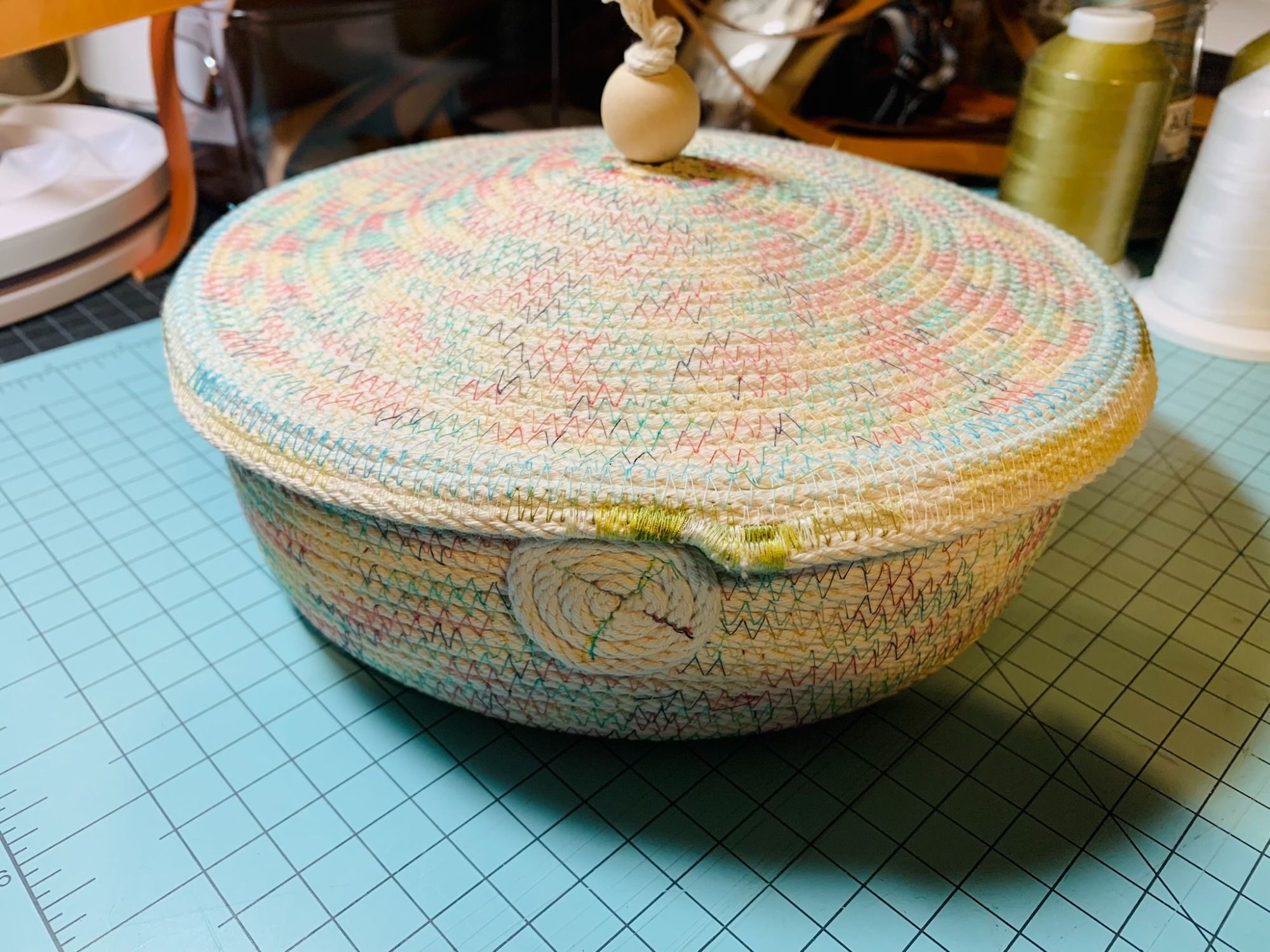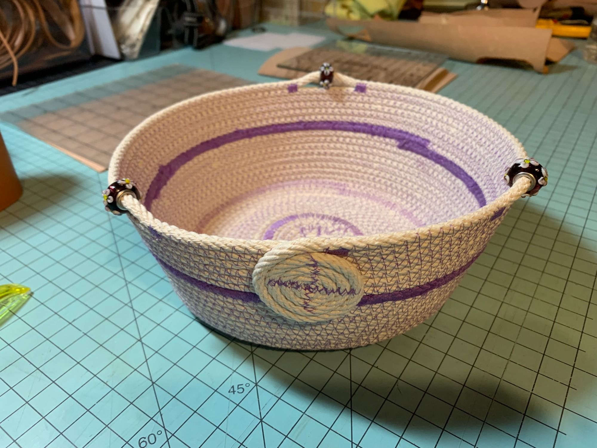 Some Bowls I have appled textile/fabric paint that is applied before sewing the rope to achieve bright, colorful stripes, or bowl rim edges on some baskets. .